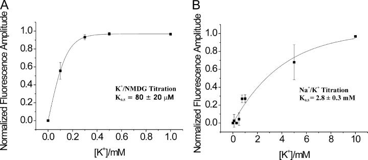 Figure 7. . Determination of the apparent K0.5 for the shift of the steady-state distribution between E1 and E2 states by external K+ at +60 mV. Data were derived from fluorescence changes for the Na+/K+-ATPase containing the β subunit construct sβ1-S62C in the presence of NMDG-based (A) or Na+-based (B) buffers. Solid lines represent fits of a Hill equation to the data (where nH = 1), with K0.5 values as stated. Each dataset was obtained from three oocytes (means ± SEM). |