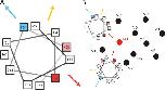 Figure 8. . Model of the analyzed region of the Na+/K+-ATPase β1 subunit and possible orientation of residues with respect to the α subunit. (A) The analyzed region of the sheep Na+/K+-ATPase β1 subunit adjacent to the extracellular plasma membrane interface is represented as a helical wheel assuming an α-helical structure. The last residue of the transmembrane domain, M57, aligns with a putative tri-glycine helix–helix interaction motif (see text), which points in the direction of the yellow arrow. The red arrow aligns with a cysteine residue (C45, not shown) within the transmembrane region of the β1 subunit that was shown to cross-link with helix M8 of the α subunit (Or et al., 1999; Ivanov et al., 2000). The blue arrow indicates the orientation of the F64 sidechain. (B) Putative orientation of the Na+/K+-ATPase β1 subunit's transmembrane helix with respect to the transmembrane domain of P2-ATPases. Views of the 10 transmembrane helices (M1 to M10) of the Na+/K+-ATPase α subunit perpendicular to the membrane plane from the cytoplasmic side are depicted as deduced from the SERCA crystal structure (Toyoshima et al., 2000). The Na+/K+-ATPase β1 subunit's transmembrane helix was oriented with C45 pointing towards M8 (in red) of the α subunit as suggested by cross-linking studies (Or et al., 1999; Ivanov et al., 2000), which allows positioning in two possible orientations according to Hasler et al. (2001). Arrows indicate the same directions as in A. |