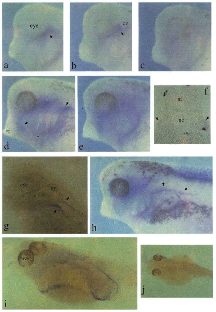 Fig. 6. Whole mount in situ hybridisations showing XKrkI expression in migrating lateral line stem cells. Embryos are albino/wild-type crosses (albino egg, wild-type sperm; these lack maternal pigment but have pigmented melanocytes) except for those in (g), (i) and cj), which are full albinos. Timings given refer to development at 23 deg C. Brown cells are melanocytes; blue indicates positive staining. (a) Stage 31/32 embryo (39 h) hybridised to antisense XKrkl probe, showing staining in a region ventro caudal to the eye. (b) Stage 33/34embryo (44.5 h) hybridised to antisense XKrkl probe, showing staining of lines of cells anterior to the otic vesicle (ov). (c) Stage 33/34embryo hybridised to sense XKrkl probe (control). (d) Stage 35/36 embryo (50 h), showing additional expression in patches adjacent to the cement gland (cg) and posterior to the gill arches (arrowheads). (e) Stage 35/36 sense control. (f) Transverse section through stage 35/36 embryo hybridised to antisense XKrkl probe. nt, neural tube; nc, notochord. Arrowheads indicate blue-staining cell clusters just beneath epidermis. Dark brown cells are melanocytes. (g) cleared stage 37/38 albino embryo (53.5 h) showing expression in bilateral ribbons of cells extending caudally from patch seen in (d). (h) Stage 37/38embryo showing similar expression to that in (g). Diffuse staining around the eye is non-specific. (i) Cleared stage 42 albino embryo (80 h) hybridised to antisense XKrkI probe. Dark- blue cells are positive. (i) Cleared stage 42 albino sense control.