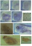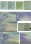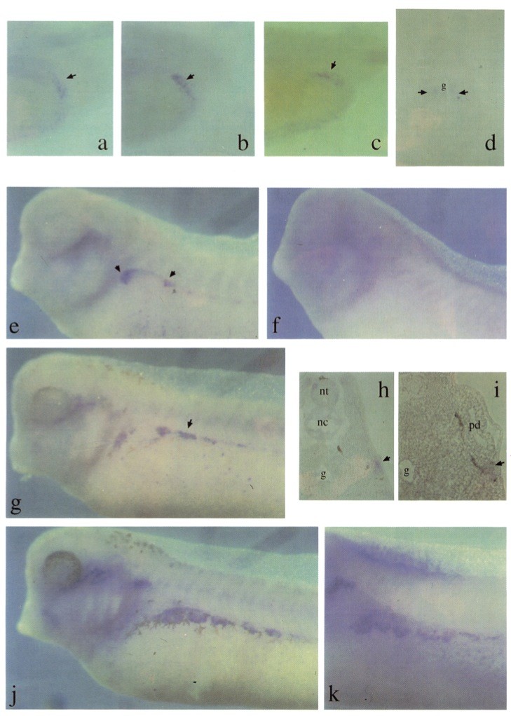 Fig. 7. Whole mount in situ hybridisations showing XKrkI expression in cells in the hindgutendoderm (a-d) and dorsal lateralmesoderm (e-k). Embryos are all albino/wild type crosses except for that in (k) which is a full albino. (a) Tailbud region of a cleared stage 26 embryo (29.5 h) hybridised to an antisense XKrkf probe, showing a cluster of positive cells (blue, arrowed) around the hindgut where it curves ventrally. (b) Tailbud region of a cleared stage 29130embryo (35 h) showing similar staining to (a). (c) Tailbud region of a cleared stage 31 embryo (37.5 h) showing similar staining. (d) Transverse section through posterior region of a stage 29/30 embryo (35 h) showing positive cells in the endodermlateral to the hind gut. g, gut cavity. Ventral cavity (unmarked) is that of the cloaca. (e) Stage 31/32 embryo (39 h) hybridised to antisense XKrkl probe. Arrowheads indicate positive staining in cell clusters ventral to the myotomes. (f) Stage31/32 sense control. (g) Stage 33/34 embryo (44.5h) showing more positive clusters. (h) Transverse section through stage 33/34 embryo hybridised to antisense XKrkl probe. Positive cells (arrowed) are seen in lateralmesoderm, dorsal to melanocytes (brown cells). nt, neural tube; nc, notochord; g, gut cavity. (i) Transverse section through stage 35/36 embryo showing positive staining in cells ventral to the pronephric duct (pd). g, gut cavity. (j) Stage 35/36 embryo (50 h) showing positive staining in U- shaped clusters ventral to the myotomes. Brown cells are melanocytes. (k) Stage 35/36 albino embryo showing positive U-shaped clusters as in (j).