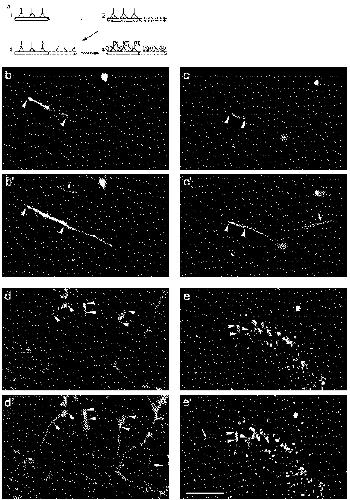 rhodamine; (e’), fluorescein) as described above. Arrowheads as in
