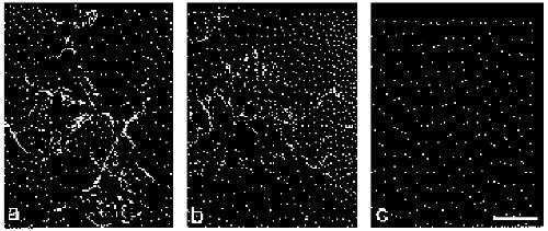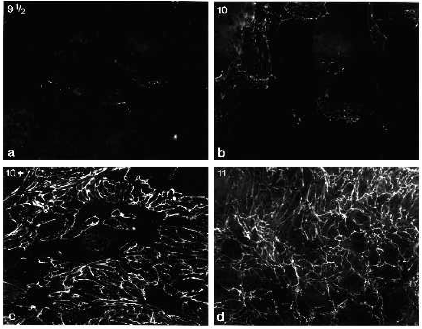 Fig. 2. FN fibril formation on the blastocoel roof of the Xenopus embryo. Blastocoel roof from stage 9 (a), stage 10 (b), stage 10+ (c) and stage