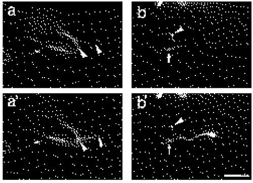 (ends marked with arrowheads in (b) and in (b’)) new fibril length