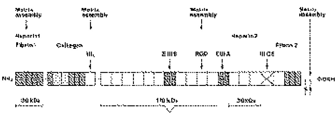 collagen-binding domains are outlined, and the RGD cell binding site in the 10th type III repeat is indicated. |