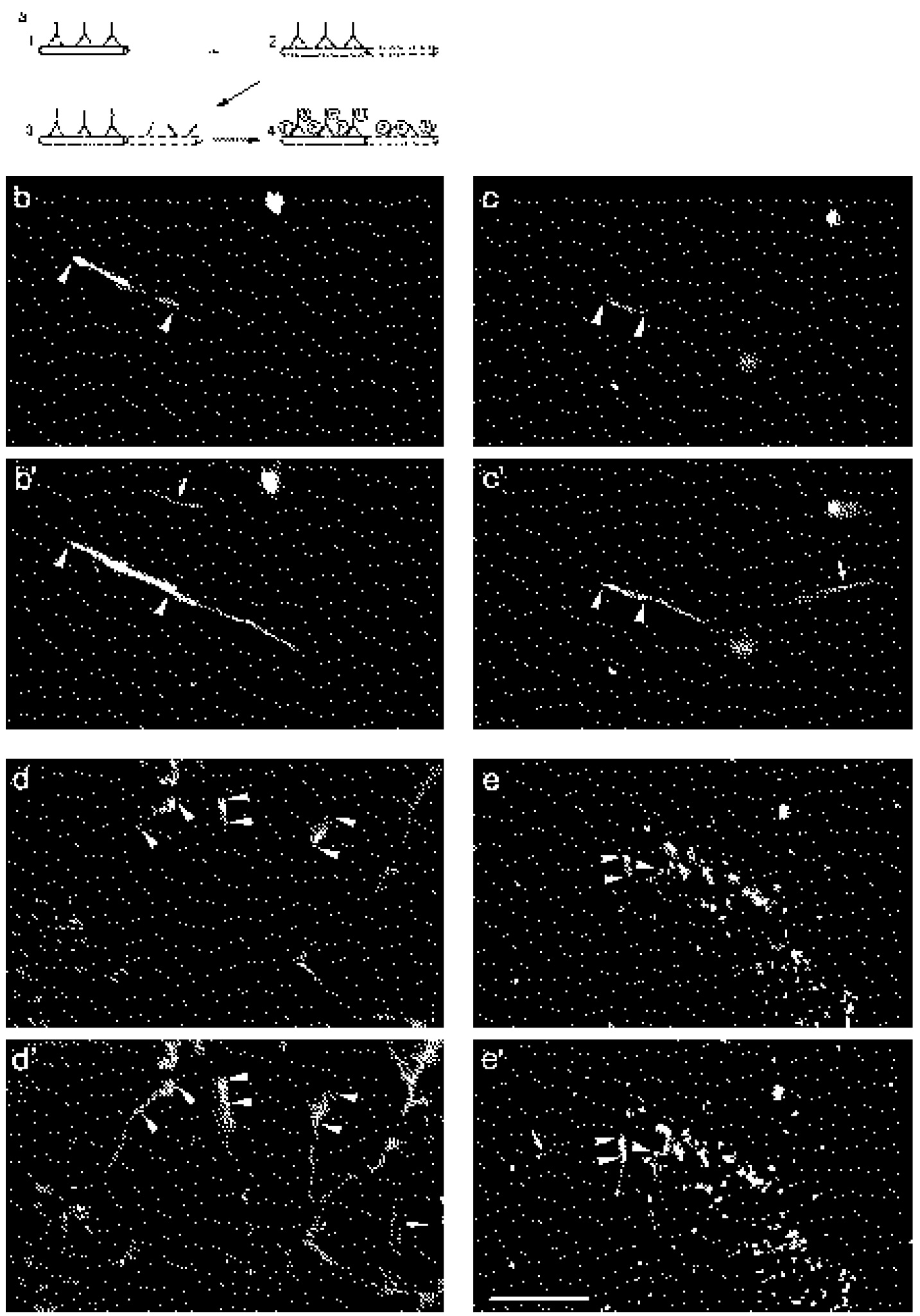 b-d; arrow, interrupted new fibril. Most fibrils, although short, did