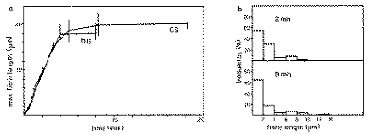 maximum fibril length during the first 4 minutes (DS) or 3 minutes (CS), respectively, is 4.7 mm/min in both cases. (b) Frequency distribution