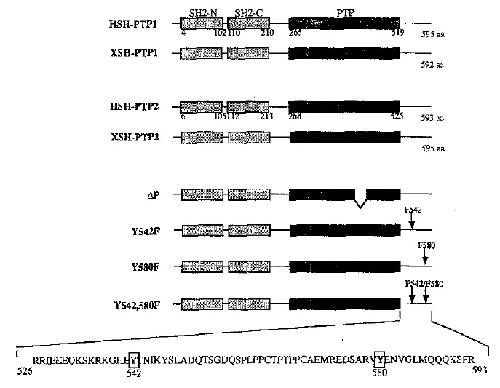 Shown are schematics of human and Xenopus SH-PTP1 and SH-PTP2