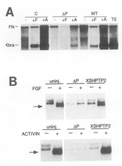 SH-PTP2, the vertebrate homolog of Drosophila corkscrew, associates with several activated growth factor receptors, but its biological function is unknown. We assayed the effects of injection of wild-type and mutant SH-PTP2 RNAs on Xenopus embryogenesis. An internal phosphatase domain deletion (delta P) acts as a dominant negative mutant, causing severe posterior truncations. This phenotype is rescued by SH-PTP2, but not by the closely related SH-PTP1. In ectodermal explants, delta P blocks fibroblast growth factor (FGF)- and activin-mediated induction of mesoderm and FGF-induced mitogen-activated protein (MAP) kinase activation. Our results indicate that SH-PTP2 is required for early vertebrate development, acting as a positive component in FGF signaling downstream of the FGF receptor and upstream of MAP kinase.