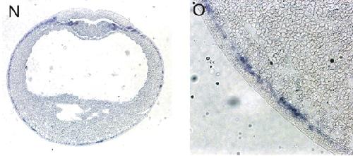 Fig. 1. xMAK expression is dynamically regulated during Xenopus development. (A) The analysis of xMAK expression at different developmental stages. Total RNA from embryos isolated at different developmental stages was used for RT-PCR. FGFR served as a loading control. RT-, no reverse transcriptase. (B-M) Spatial distribution of xMAK RNA revealed by whole-mount in situ hybridization of albino embryos at indicated stages. (B-E,J,K) xMAK antisense probe. (F,G,I,L,M) xMAK sense probe. (D) Anterior view; e, eye; MHB, midbrain-hindbrain boundary. (H) En2 and Krox20 probes, anterior view. En2 is expressed as a bright band at the MHB, located anterior to Krox20, which marks rhombomeres 3 and 5. (B,F) Animal pole view; (C,G) lateral view; (E,I) dorsal view, anterior is towards the left. (J-M) Lateral view, anterior is towards the left. (K) e, eye; ov, otic vesicle; ba, branchial arches; tb, tailbud. (N,O) A cross-section of a stage 17 neurula embryo after in situ hybridization with xMAK antisense probe. Staining is observed in the deep (sensorial) layer of epidermal ectoderm (magnified view shown in O) and in somitogenic mesoderm. |