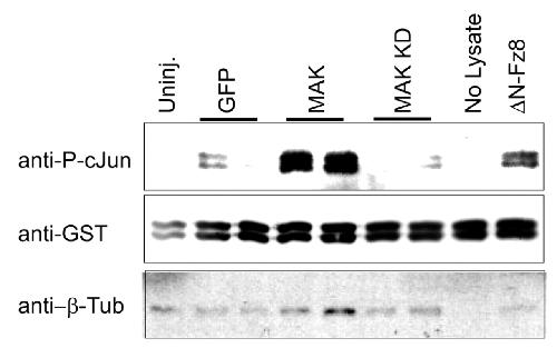 Fig. 3. MAK (hunk) is an activator of JNK. JNK activity was analyzed in embryonic lysates by in vitro phosphorylation of GST-Jun(1-135). Four-cell embryos were injected marginally four times with GFP, MAK or MAK-KD RNA (1.5 ng per injection), or δN-Fz8 RNA (0.5 ng per injection) as a positive control. Lysates were collected at stage 14 for JNK activity determination by western analysis with anti-phospho-Jun antibodies. Assays were carried out in duplicates, with 10 embryos in each experimental group. Anti-GST and anti-β-tubulin antibodies indicate loading. |