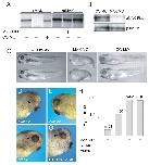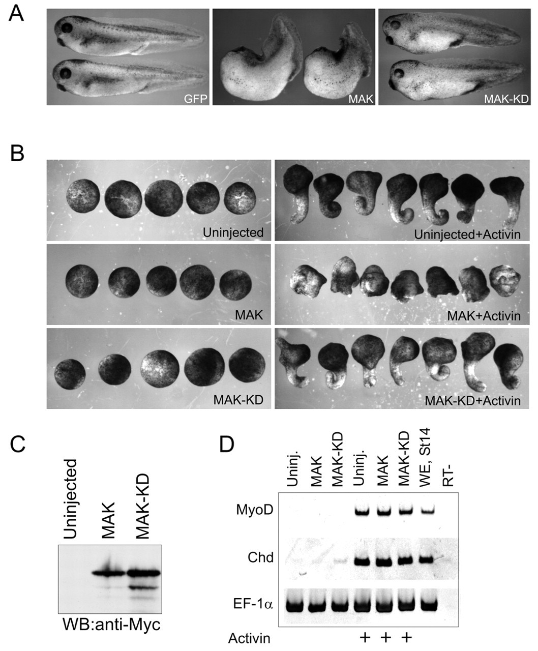 Fig. 2. MAK (hunk) causes morphogenetic defects and head abnormalities. Four-cell stage embryos were injected into dorsal equatorial region (A, two injections) or animal pole region (B-D, four injections), with RNAs encoding wild-type MAK, MAK KD or GFP, as indicated, at 2 ng per injection. (A) Morphological analysis of MAK-expressing embryos. Embryos were fixed at stage 38 and scored for axis elongation and head defects. (B) The effect of MAK on morphogenetic movements. Animal caps were isolated from injected midblastula embryos and treated with 50 ng/ml of activin. MAK, but not MAK KD, inhibited animal cap elongation in response to activin. (C) Expression levels of Myc-tagged MAK and MAK-KD, revealed by Western blot analysis with anti-Myc antibodies in lysates of injected embryos at stage 10. (D) MAK does not inhibit mesoderm markers induced in animal caps by activin. Animal cap induction was as in B. The mesodermal markers MyoD, Chordin and Goosecoid were assessed in animal caps by RT-PCR, when sibling embryos reached stage 14. Whole embryo (WE) RNA is a positive control. Uninj., animal caps from uninjected embryos. RT-, no reverse transcriptase. EF-1α is a loading control. |