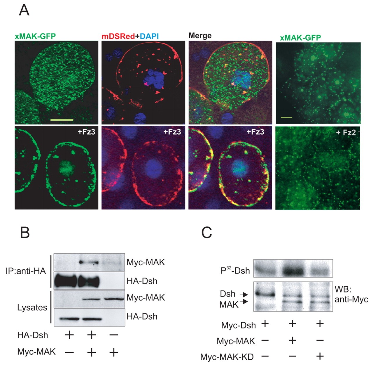 Fig. 4. MAK (hunk) interacts with Frizzled and Dishevelled. (A) Fz3 RNA recruits MAK to the cell membrane in animal pole cells. xMAK-GFP RNA was injected either with membrane-targeted dsRed RNA or with dsRed and Fz3 or Fz2 RNAs and GFP fluorescence was visualized in animal pole cells isolated from injected embryos at stage 10. xMAK-GFP is distributed in a punctate cytoplasmic pattern. Membrane-targeted dsRed RNA allows visualization of the cell membrane. Upon Fz3 RNA coexpression, xMAK-GFP is recruited to the cell membrane. The bottom right panel shows lack of effect of Fz2 RNA on xMAK-GFP localization (compare with top right panel). Bars on top left and top right panels are 5 μm. (B) MAK co-immunoprecipitates with Dsh. Lysates of embryos injected with Myc-MAK RNA (2 ng) and/or with HA-Dsh RNA (4 ng) into each cell of four-cell embryos were collected at stage 10 and immunoprecipitated with anti-HA antibodies. Western analysis with anti-Myc antibodies reveals a complex of Dsh and MAK. (C) In vitro phosphorylation of Dsh by MAK. Autoradiography (upper panel) reveals phosphorylation of in vitro translated Myc-Dsh that was co-immunoprecipitated with Myc-MAK or Myc-MAK-KD from in vitro translated lysates. Lower panel shows protein levels. |