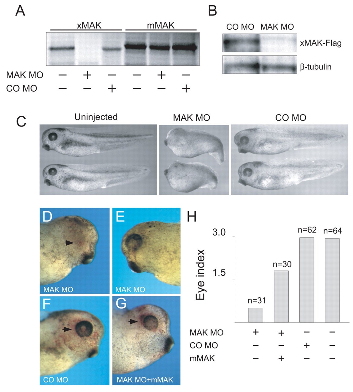 Fig. 5. Axis elongation and eye defects in MAK-depleted embryos. (A) xMAK MO specifically inhibits in vitro translation of xMAK RNA. Autoradiography of in vitro translated 35S-methionine-labeled proteins is shown. No suppression is observed for mMAK RNA, which lacks morpholino target sequence. (B) MAK MO inhibits xMAK translation in vivo. Western analysis with anti-Flag antibodies shows that MAK MO, but not COMO, effectively downregulated levels of Cterminally tagged xMAK in injected embryos. Loading is controlled with anti-β-tubulin. (C) MAK MO or COMO was injected into two dorsal blastomeres of four-cell embryos. At stage 38, MAK-depleted embryos had shortened axes and eye deficiencies (see also Table 2). (D-H) Eye defects caused by MAK MO injection can be partially rescued by mouse MAK RNA in stage 38 embryos. Eight-cell embryos were injected into one animal dorsal blastomere with nβgal RNA as a lineage tracer, together with MAK MO (D,E), COMO (F) or MAK MO and mouse MAK RNA (G). (D,E) Both sides of the same injected embryo. Red staining (arrowheads) reflects lineage tracing. (H) The average eye index was calculated for each group of embryos at stage 38 as follows. 0, no visible eye; 1, severely disrupted retina with little pigmentation; 2, small or partially pigmented eye; 3, wild-type eye. |