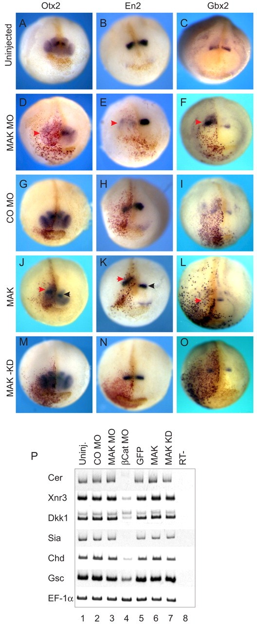 Fig. 7. MAK functions in regional brain patterning, but does not affect organizer markers. (A-O) MAK regulates midbrain-hindbrain boundary. Dorsal-animal region of four-cell embryos was injected with 50 ng of MOs or 2 ng of MAK RNAs, as indicated, together with nβgal RNA as a lineage tracer. At stage 20, Otx2, En2 and Gbx2 were assessed by whole-mount in situ hybridization. MAK MO inhibited Otx2 and En2 (D,E), but upregulated Gbx2 (F). MAK RNA expanded and posteriorly shifted Otx2 and En2 on the injected side (J,K), and inhibited Gbx2 (L). Red arrows indicate altered expression; black arrows indicate marker expression on the uninjected side. (P) MAK depletion or overexpression does not affect organizer marker expression. Two to four-cell embryos were injected twice in the dorsal margin with MAK MO or COMO (100 ng), β-catenin MO (30 ng) or indicated RNA (4 ng). RT-PCR was carried out with total RNA from stage 10 embryos. DNA fragments were separated in 6% SDS-polyacrylamide gel. EF-1α is a loading control. Uninj, uninjected embryos. RT-, no reverse transcriptase. |