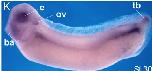 hunk (hormonally up-regulated Neu-associated kinase) gene expression in Xenopus laevis embryo, assayed via in situ hybridization, NF stage 23, lateral view, anterior left, dorsal up. |
