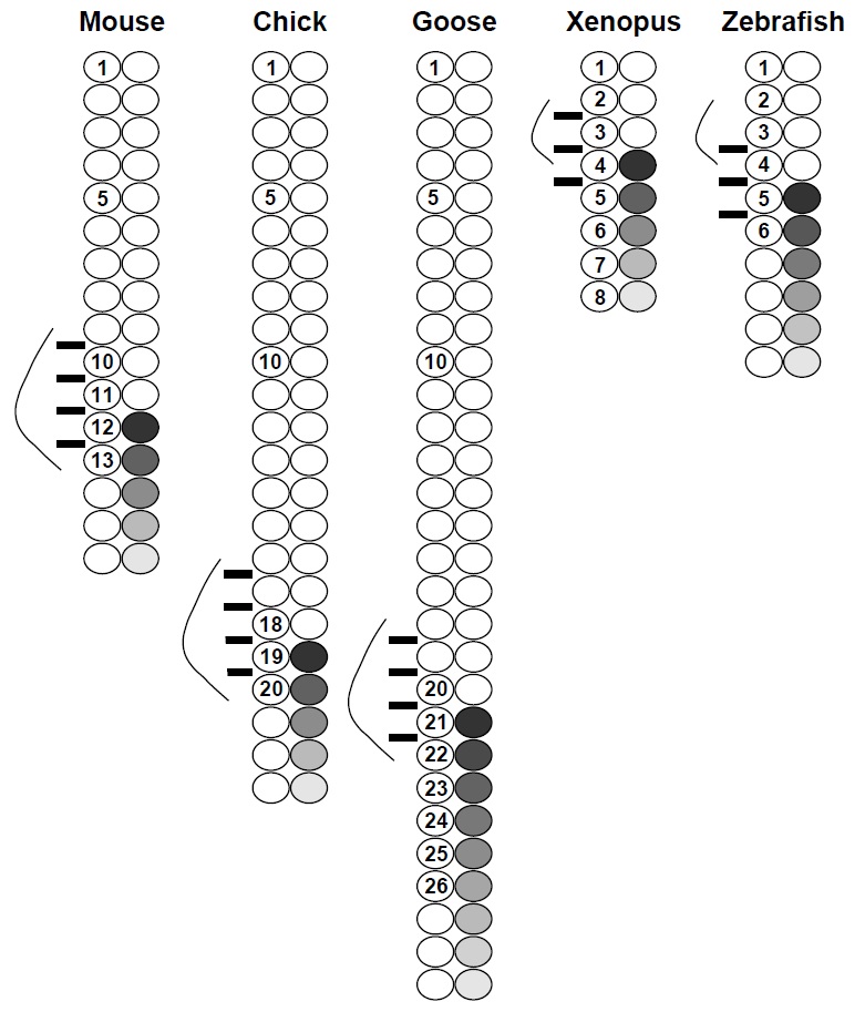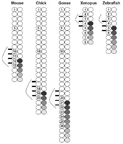cervical-thoracic transition in mouse, chick, goose, Xenopus,