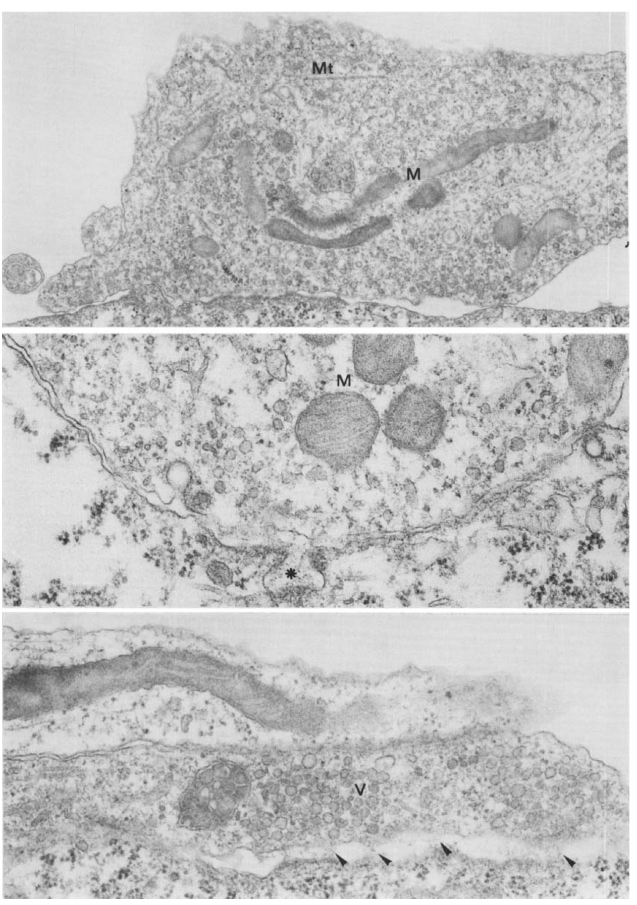 membranes is wider. Basal lamina-like material was not detectable. Mt, microtubules. Arrows indicate large dense-core vesicles. Magnification: a, X24 OOO;