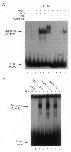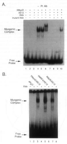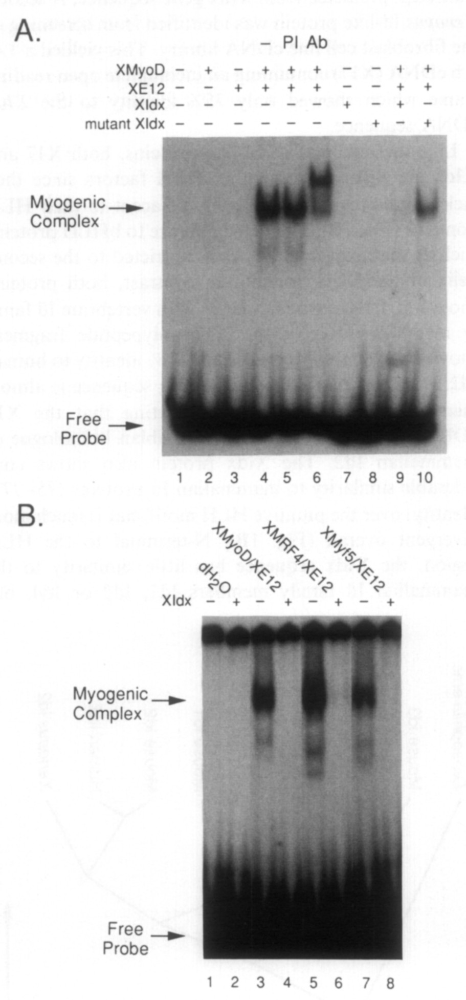 Fig. 3. Xldx inhibits formation of a myogenic complex in vitro. Panel A. Rabbit reticulocyte lysates programmed with synthetic XMyoD, XEI2 and XIdx RNA were tested in an electrophoretic mobility shift assay (EMSA) using the MCK right E box motif as a probe. The myogenic complex formed by XMyoD/XE12 was identified using the monoclonal antibody, DF72 (Ab) and comparing its effect with nonspecific tissue culture supernatant (PI). Panel B. Lysates programmed with XE12 in combination with either XMyoD, XMRF4 or XMyfl all form a myogenic complex with the MCK E-box probe (-). This is blocked by the inclusion of XIdx RNA in the translation reaction (+).