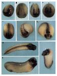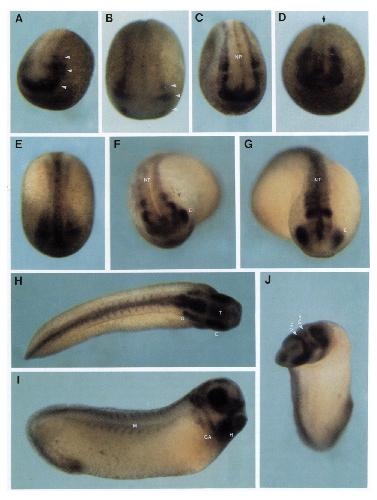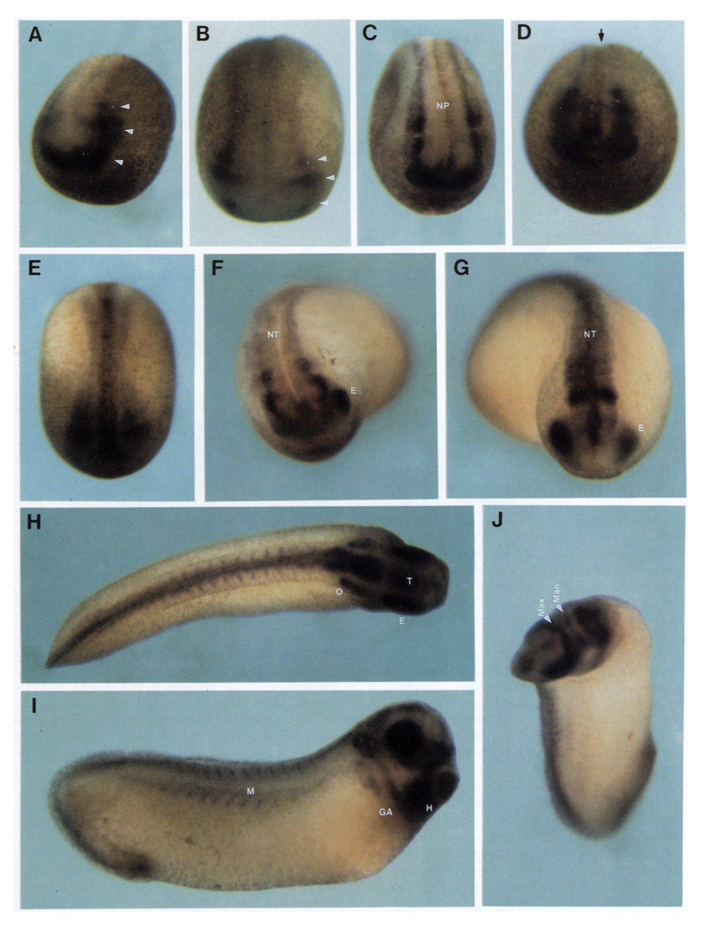 Fig. 7. Xldx mRNA accumulates in distinct regions of the neural tube in early embryos. Neurula and tailbud embryos were stained for XIdx RNA by whole mount in situ hybridisation, using a digogygenin-labelled probe. Panels A and B: Anterior and dorsal views of early neurula embryos showing high levels of Xldx transcripts within three discrete regions (arrows) of the anterior neuroepithelium. Panel C: A mid neurulaembryo (stage 15) showing additional accumulation of high levels of X1d.u transcripts around the edges of the neural plate (NP). Panels D: and E: Anterior and dorsal views of late neurula embryos (stage 18). In Panel D. the position of the closing neural grove is marked by an arrow. The most anterior domain of Xldx expression splits into two regions (compare C and D). Panels F and G: During fusion of the neural folds (stages 20 and 21, respectively), expression of Xldx becomes more pronounced along the length of the neural tube (NT), and the most anterior domain of expression within the brain forms the eye vesicles (E). Panels H-J: Dorsal, lateral and anterior views of a late tailbudembryo (stage 28). In addition to the staining within the nervous system, staining can be seen in the myotomes and headmesenchyme. In the dorsal view (panel H), staining can be seen along the length of the spinal chord and within the hindbrain. The position of the otic vesicle (0) and the eye vesicles (E) are marked. Between the eye vesicles, diffuse staining of the optic tectum (T) is evident. The lateral view (panel I) shows the strong staining within the dorsal and ventral parts of the myotomes (M). High levels of expression are also evident in the mesenchyme of all three skeletal arches. In Panel I, the staining in the base of the hyroid arch (H) and the gill arches (GA) is indicated. The anterior view (J) shows staining of the maxillary (Max) and mandibular (Man) processes of the first arch.