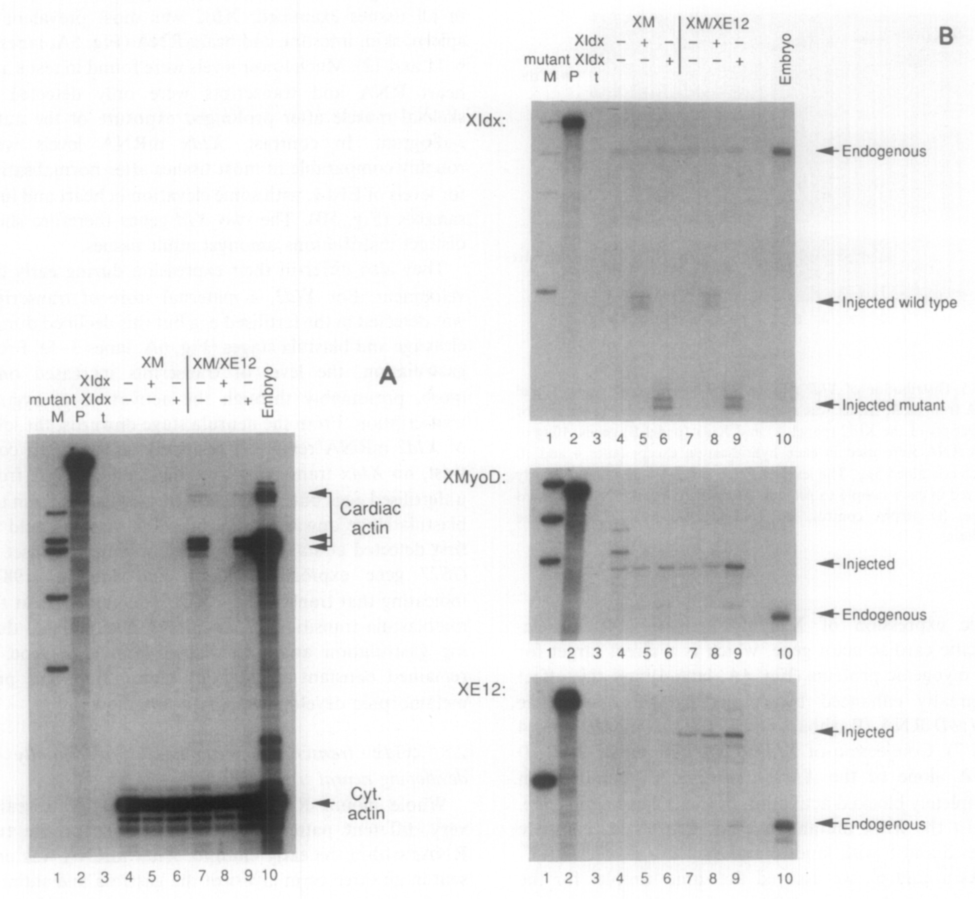 Fig. 4. Xidx blocks activation of the muscle-specific cardiac actin gene in vivo. Fertilised eggs were injected with synthetic XMyoD, XEl2, Xidx and Xldx(val-58) mutant RNAs as indicated. Animal pole explants were assayed at the neurula stage for muscle-specific cardiac actin transcripts (panel A). Due to cross hybridisation, this probe also provides an estimate of relative cytoskeletal actin transcript levels which are used as a loading control. The same samples were also analysed for the presence of both endogenous and injected Xidx, XMyoD and XE12 transcripts (panel B). (M): end labelled pBR322 Hinfl size markers; (P): probe: (t): tRNA control: lanes 4-6: XMyoD RNA injected alone. with XIdx or XIdx(val-58)mutant RNAs, respectively; lanes 7-9: as in lanes 4-6 with the inclusion of XE12 RNA; lane 10: stage-20-embryo total RNA.
