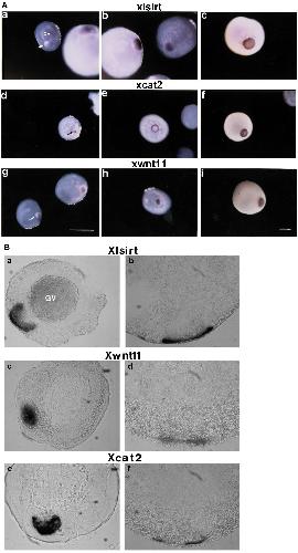 Fig. 2. (A) Whole-mount in situ hybridization to different stage oocytes showing the patterns of Xlsirts, Xcat2 and Xwnt11 RNAs within the