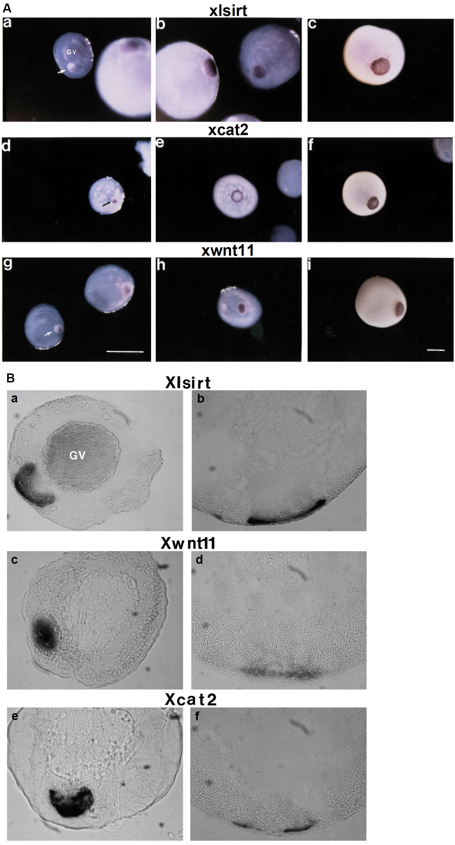 with the Xlsirt, Xwnt11 and Xcat2 probes, respectively. Panels b, d and f are sections of stage 3 oocytes. GV, germinal vesicle.