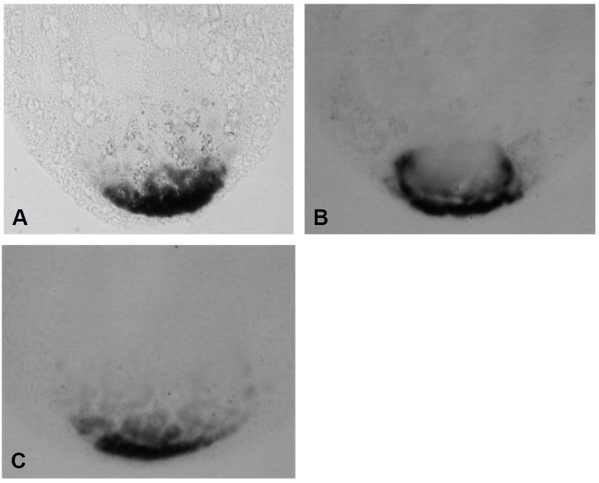 localized in a disk-like pattern at the apex of the vegetal pole. The colors of the two