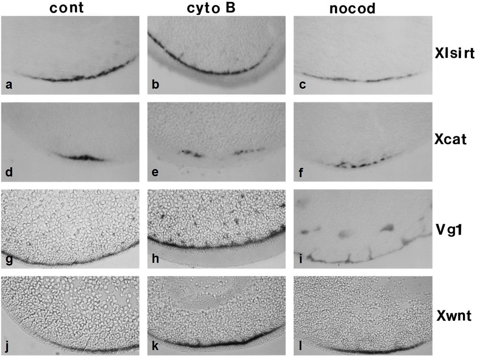 and hybridized with the Xlsirt, Xcat, Vg1 and Xwnt11 probes respectively. Panels b, e, h and k are oocytes treated with cytochalasin B for 2