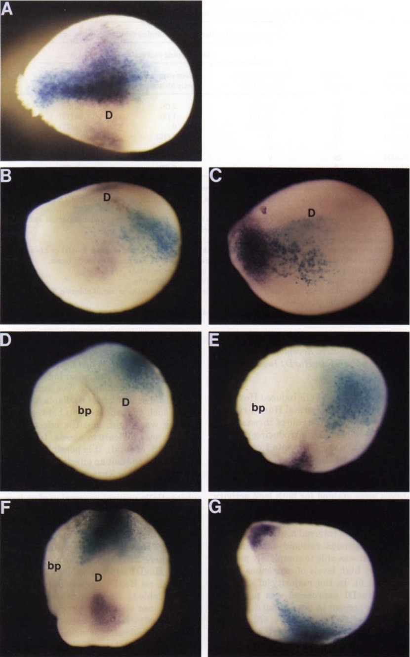 Fig8. HoxD1 expression is ablated by the misexpression of dominant negative receptors. Data is detailed in Table 1. Albino embryos were micro-injected with a mixture of B-galactosidase mRNA (as a tracer) and dominant negative mRNA in one blastomere of a 2-cell embryo as described under Materials and Methods (thyroid hormone receptor: c-erbA (Barattino et al. 1993); dominant negative activin receptor: XAR delta (Hemmati-Brivanlo et al 1992); dominant negative fibroblast growth factor receptor: XFD (Amaya et al 1991). Embryos were allowed to develop to late gastrula-early neurula stage (Stage 12.5-13) and expression of HoxD1 was examined by in situ hybridization as described above. The expression of the mesodermal marker Xbra was also examined as a control. Xbra is expressed around the blastopre and in the notochord. At the stage examined (stage 12.5-13) the notochord has just begun to extend, so that notochord staining is visible to varying degrees (Nieuwkoop and Faber 1967). lacZ staining (light blue) localizes the injected mRNA. this staining is punctate due to a nuclear localization signal linked to the lacZ protein. Failure to see overlap of lacZ stain and HoxD1 mRNA in the normal domain of HoxD1 expression indictates ablation of expression by the dominant negative receptor. (A) HoxD1 expression; CAT RNA injected, dorsal view. (B) HoxD1 expression: c-erbA RNA- injected, dorsolateral view. (C) Xbra expression: c-erbA RNA-injected, dorsolateral-view. (D) HoxD1 expression: XARdelta RNA-injected, dorsal view. (E) Xbra expression, XARdelta RNA injected. (F) HoxD1 expression: XFD RNA-injected, dorsal view. (G) Xbra expression: XFD RNA-injected. Anterior is to the right. D= dorsal midline; bp= blastopore.