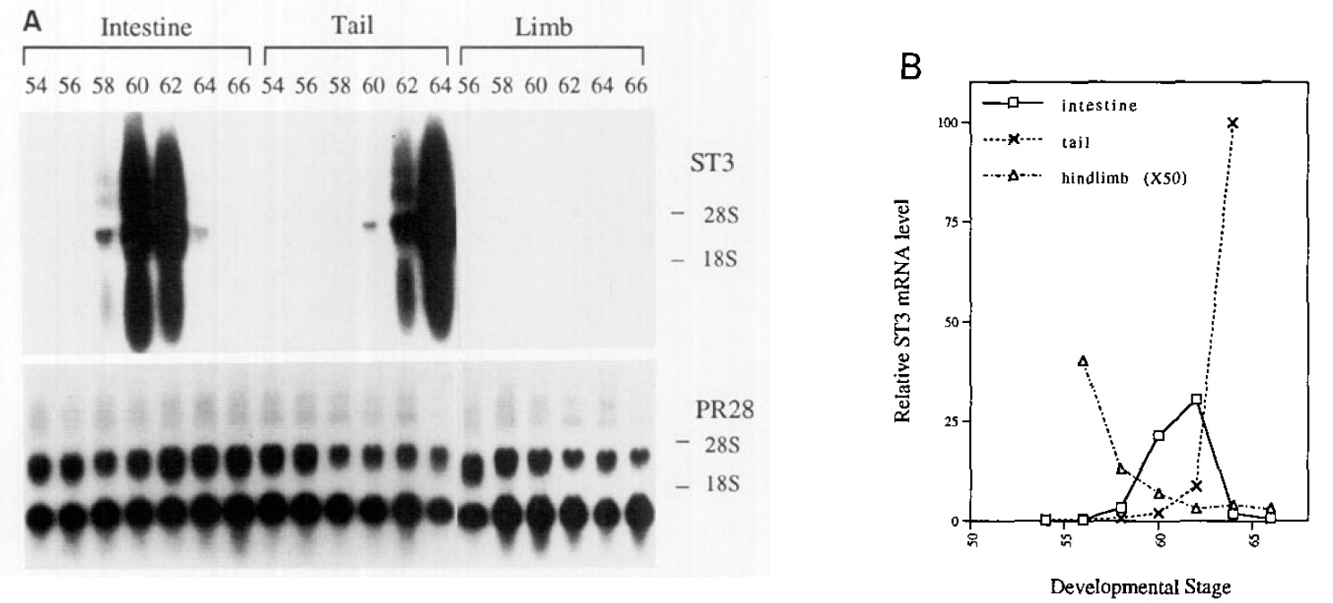 hindlimb at stage 56; levels of ST3 mRNA were normalized to that of tbe PR28 control; to facilitate the graphing of low levels of ST$ mRNA