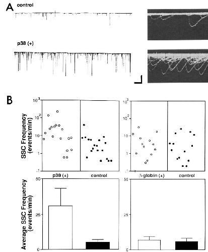 the slow andfast traces, respectively. B, SSC frequency for p38(+) synapses and control synapses (left) and @-globin and control synapses (right).