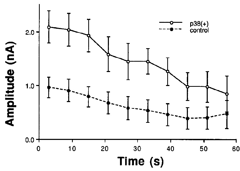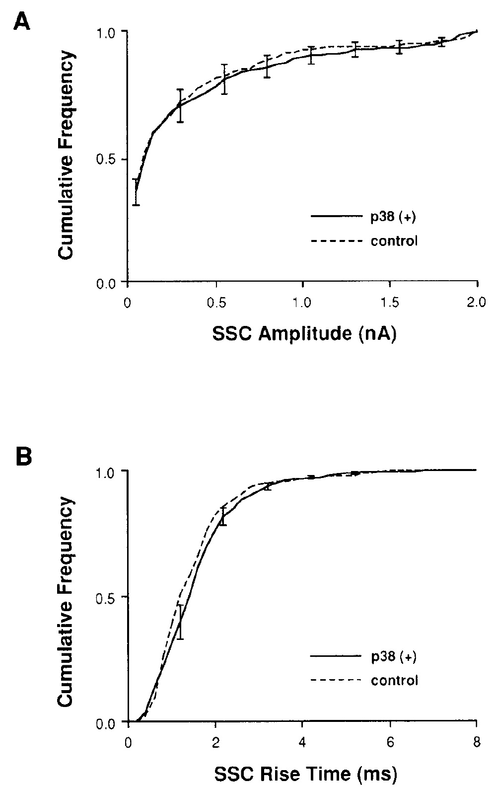 for p38(+) (solid line) and control (dashed he) synapses. Curves represent
