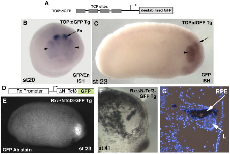 The TOP:dGFP transgene (A) is expressed in the developing eye (arrowhead) at stage 20 (B), and stage 23 (C), as revealed by in situ hybridization. The midbrain/hindbrain boundary is marked by En expression (arrow in [B]) or reporter expression (arrow in [C]). (D) Rx promoter driving ÎN-Tcf3 tagged with GFP (Rx:ÎN-Tcf3-GFP). (E) GFP antibody staining reveals transgene expression in the developing eye (stage 23). (F) Disrupted eye development in transgenic embryos (stage 41). (G) Sections through the same embryo reveal loss of neural retina tissue, but remnants of RPE and lens (L). Section is stained with the nuclear dye Hoechst (blue). |