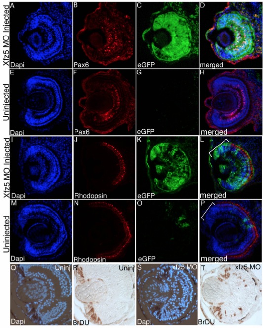 The eye size on the Xfz5 MO-injected side (A and I) is smaller than on the uninjected control side (E and M), although lamination of the neural retina is normal as demonstrated by Hoechst nuclear staining. Ganglion and amacrine cells (B and F; α-Pax6 antibody staining) as well as rod photoreceptors (J and N; α-rhodopsin antibody staining) are properly positioned within their respective layers on both the uninjected (F and N, respectively) and the injected side (B and J, respectively). eGFP expression (C and K) identifies the Xfz5 MO-injected side. (D), (H), (L), and (P) are the merged images of Hoescht nuclear staining, antibody staining, and eGFP expression. Note that the antibody staining on the uninjected side extends more peripherally than that on the injected side (compare brackets in [L] and [P]), suggesting that the retina on the injected side has a larger CMZ reminiscent of a more immature retina. (Q–T) BrDU analysis on stage 41 retinas. (Q and R) BrDU labeling is restricted to the CMZ on the uninjected control side. (S and T) BrDU- labeled cells are detected in the central retina as well as the CMZ on the Xfz5 MO injected side, indicating that the central retina is not fully postmitotic and may be delayed in its development. The number of BrDU cells within the CMZ is similar for control versus the Xfz5 MO-injected side. |