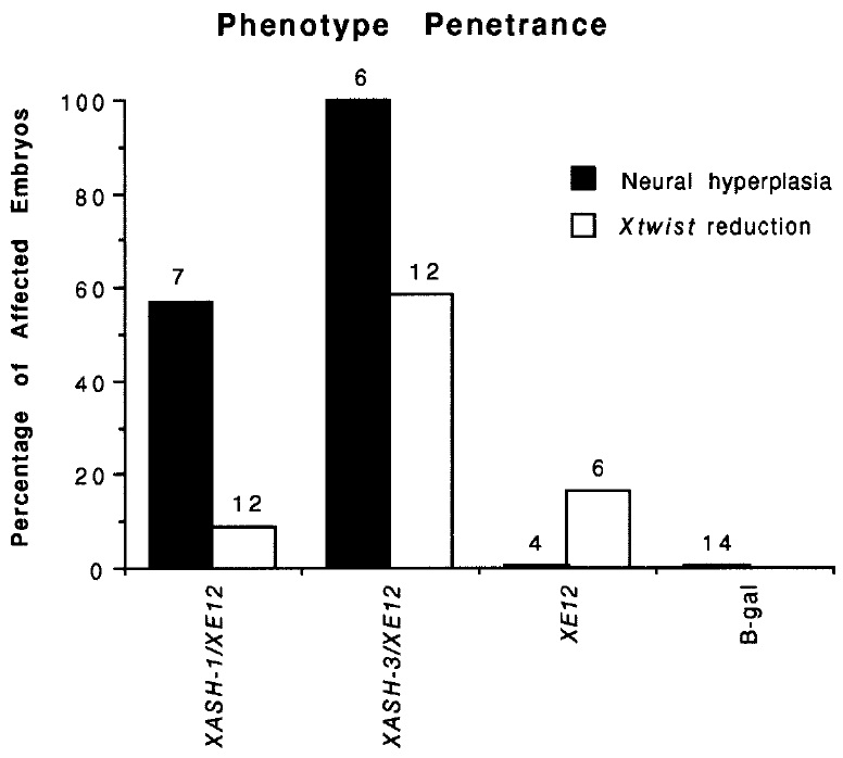 Fig. 3. Phenotypes of XASH/XE12-injected embryos. (A). Direct dorsal view of a whole-mount embryo injected with 90 pg ofbXASH-3 mixed