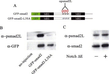 Fig. 6. The effect of Notch signaling on linker-region-phosphorylation of smad2. (A) Diagram of GFP-smad2 and GFP-smad2-L3SA in which the three linker region serine residues were substituted by alanine residues. αp-smad2L selectively recognized smad2 phosphorylation at the linker region. (B) Two-cell-stage embryos were injected with GFP-smad2 or GFP-smad2-L3SA. Embryos were harvested at stage 12 and smad2 linker-region phosphorylation levels were examined by western blotting using αp-smad2L. (C) Animal caps injected with 1 ng of Notch ΔE or non-injected controls were dissected at stage 11, and smad2 linker-region phosphorylation levels were examined by western blotting using αp-smad2L. Smad2 levels served as the loading control.