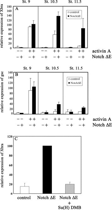 Fig. 1. The effect of Notch signaling on activin-induced Xbra and goosecoid expression. Animal caps injected with 1 ng of Notch ΔE were dissected at stage 9, 10.5, and 11.5, and then treated with 10 ng/ml of activin A, followed by incubation for 5 h. The relative Xbra (A) and goosecoid (B) expression levels were calculated using real-time RT-PCR. (C) Animal caps injected with 1 ng Notch ΔE alone or co-injected with 1 ng Notch ΔE and 1 ng Su(H) DBM were dissected at stage 11.5, and then treated with 10 ng/ml activin A, followed by a 5-h incubation. The relative Xbra expression level was calculated using real-time RT-PCR. The efficiency of cDNA synthesis was assessed on the basis of real-time RT-PCR for ODC. The results represent the mean from three or four independent experiments and error bars indicate the SEM. Black column, Notch ΔE-injected animal caps; White column, uninjected control animal caps, Gray column, Notch ΔE and Su(H) DBM-injected animal caps.