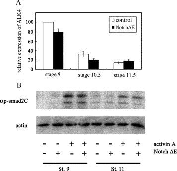 Fig. 3. The effect of Notch signaling on ALK4 expression level and C-terminal-phosphorylation of smad2. ALK4 maintained the ability to phosphorylate the C-terminal region of smad2 upon activin A stimulus even after the onset of LMC. (A) The relative expression levels of ALK4 were calculated using real-time RT-PCR. Animal caps injected with 1 ng of Notch ΔE were dissected at stages 9, 10.5, and 11.5. The efficiency of cDNA synthesis was assessed on the basis of the real-time RT-PCR for ODC. The results represent the mean from three or four independent experiments and error bars indicate the SEM. Black column, Notch ΔE-injected animal caps; White column, uninjected control animal caps. (B) The amount of C-terminal-phosphorylated smad2 was examined by western blotting using anti-phosphorylated-smad2C antibody (αp-smad2C), which recognized the phosphorylated C-terminal region of smad2. Animal caps injected with 1 ng of Notch ΔE or non-injected controls were dissected at stage 9 and stage 11, and treated with 50 ng/ml of activin A. Actin levels served as the loading control.