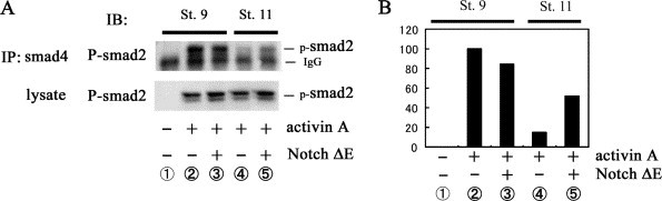 Fig. 4. The effect of Notch signaling on formation of a complex formation between C-terminal-phosphorylated smad2 and smad4. Animal caps injected with 1 ng of Notch ΔE (lanes 3 and 5) or control animal caps (lanes 1, 2 and 4) were dissected at stage 9 (lanes 1, 2 and 3) or stage 11 (lanes 4 and 5), and treated with 50 ng/ml of activin A. Lysates were immunoprecipitated with anti-smad4 antibody (IP) and western blotted with αp-smad2C antibody. The level of smad2 C-terminal phosphorylation was quantitated and the values plotted.