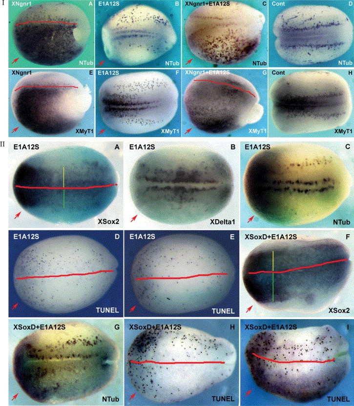 Fig. 3. Consequences of HAT inhibition on primary neurogenesis and early neural cell death. Panel 3-I. Embryos were not treated with HUA. All embryos are shown with anterior to the left in their dorso-lateral views (A, C, E and G) and dorsal views for (B, D, F and H). The dorsal midline is indicated in red (A, E and G). (A, E) Embryos were microinjected with: (A, E) XNgnr1 (10 pg/nl) and GFP (50 pg/nl), (B, F) E1A12S (0.2 pg/nl) and GFP (50 pg/nl) and (C, G) XNgnr1 (10 pg/nl) and E1A12S (0.2 pg/nl) and GFP (50 pg/nl) mRNAs as indicated in the top left corner (as in Fig. 1). The injected is shown as the bottom half (red arrow). Embryos were subjected to whole-mount in situ hybridization with probes specific for (A) N-Tubulin and (E) XMyT1 as indicated in the bottom right corner. Panel 3-II. Embryos were treated with HUA. Dorsal views of stage 15 embryos with anterior to the left. The dorsal midline is indicated in red (A, D, E, F, H, I). Embryos were microinjected with: (A) E1A12S (0.2 pg/nl) and GFP (50 pg/nl), (F) E1A12S (0.2 pg/nl) and XSoxD (100 pg/nl) and