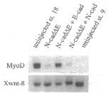 ???displayArticle.abstract??? Muscle progenitors in Xenopus interact in a community of 100 or more cells to activate their myogenic genes and the muscle differentiation pathway. We examine whether the cell adhesion molecule cadherin is involved in this process. Injections of dominant negative N-cadherin RNA into the region of 2- to 4-cell embryos that will give rise to muscle suppress MyoD expression in muscle progenitor cells. By contrast, Xbra expression is unaffected and levels of Xwnt-8 message rise with increasing doses of dominant negative cadherin RNA. MyoD inhibition in embryos injected with the dominant negative cadherin mRNA is rescued by coinjection of full-length cadherin RNA, showing that the inhibition of MyoD occurs through the cadherin pathway. These results show that cadherin-mediated cell interactions play a critical role in the signaling events required for muscle progenitor cells to differentiate, as judged by their stable activation of MyoD.