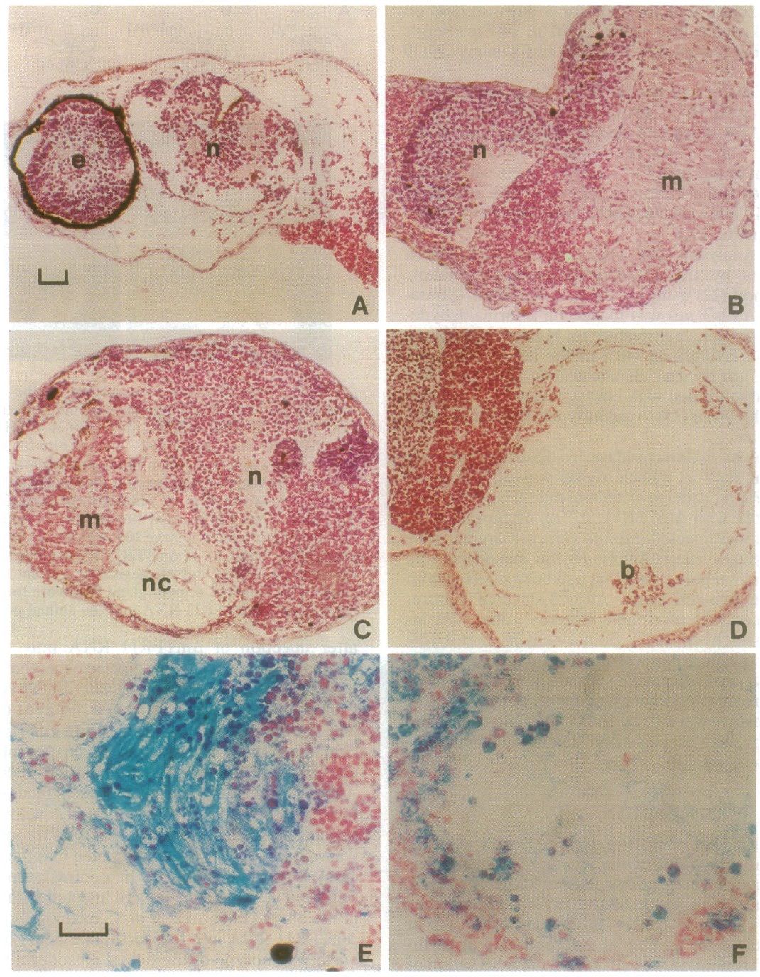 containing blood cells (b) was developed in the explants injected with H20 (D, control). A and B were different sections of the embryos. (E and