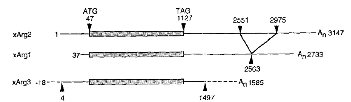The lengthso f cDNAclones are 2.7,3.1, an1d. 6 kilobase pairsf or argl, arg2, and arg3, respectively. Each clone has ano pen reading framee ncoding