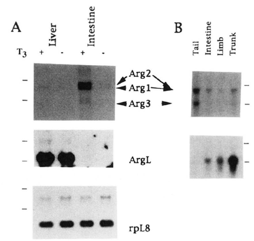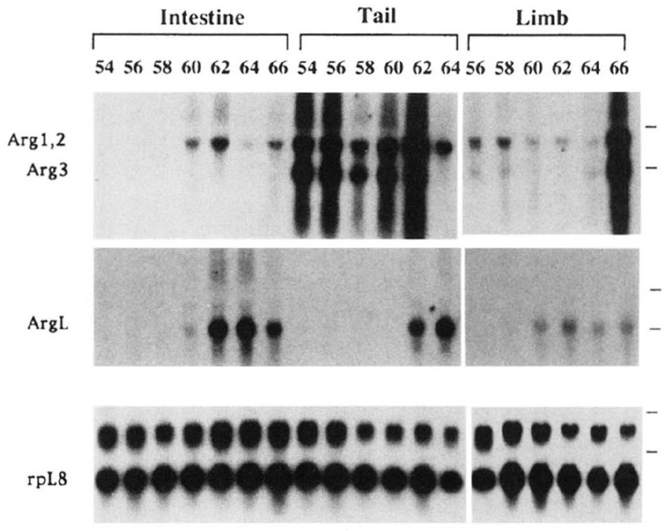Xenopus arginase genes in different tissues/regions of stage 60 metamorphosing