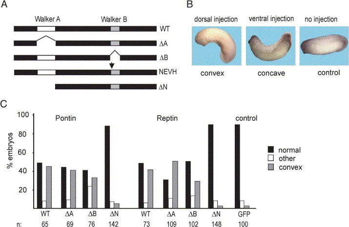 Fig. 1. xPontin and xReptin overexpression result in bending of Xenopus embryos. (A) Diagram of Xenopus wtPontin (457aa) and wtReptin (462aa) and the mutants used. The position of the Walker A (white box) and the Walker B (grey box) motifs are indicated. Point mutants "NEVH" were generated according to (Mezard et al., 1997): in Pontin this is D302N, in Reptin D299N. N-terminal deletions are PontinδN: δ1â135aa, ReptinδN: δ1â84aa. Walker A deletion: Pontinδ70â77, Reptinδ76â83, Walker B deletion: Pontinδ302â306, Reptin δ299â303. All constructs contain a myc-tag at the C-terminus. (B) Overexpression of xPontin and xReptin induces bending of embryos. Dorsal injections led to convex, ventral injections to concave shaped embryos. XPontin injected embryos are exemplarily shown. (C) Percentage of embryos displaying a convex phenotype upon injection of the indicated constructs into both dorsal blastomeres of Xenopus 4-cell stage embryos. Phenotypes were scored at stage 30 (Nieuwkoop and Faber, 1967). The numbers of injected embryos are given at the bottom.