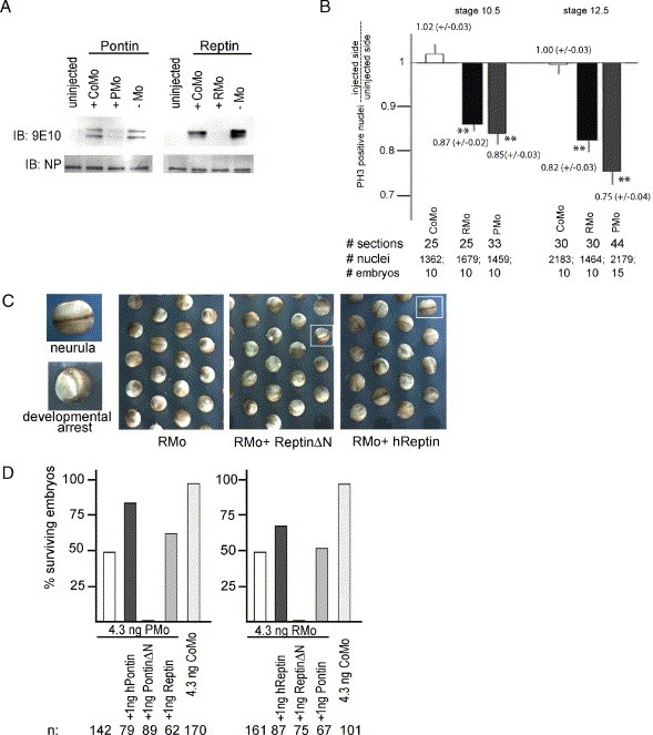 Fig. 3. xPontin and xReptin are required for proliferation and development beyond the gastrula stage in Xenopus embryos (A) Immunoblots documenting expression of xPontin and xReptin in early neurulae upon injection of the indicated morpholino oligonucleotides into two-cell stage embryos. Both blastomeres were co-injected with 1 ng myc-tagged Pontin or Reptin mRNA and 4.3 ng of the indicated morpholinos, PMo: antisense Pontin, RMo: antisense Reptin, CoMo: corresponding control morpholino, -Mo: without morpholino. Upper panel shows an immunoblot of embryo lysates stained with 9E10 antibody for the exogenous Pontin and Reptin. Lower panel shows staining for nucleoplasmin (NP) used as loading control. B) Quantification of PH3 positive nuclei in stage 10.5 and 12.5 embryos co-injected at the 2-cell stage with the indicated morpholino oligonucleotides and GFP mRNA. Values are given in relation to the non-injected side. The percentage of positive nuclei at the non-injected side was set to 1. ** p-value in student t-test < 0.005, ânsâ p-value in student t-test > 0.02. (C) Phenotype of embryos, in which both blastomeres of two-cell stage embryos were injected with Reptin antisense morpholino (RMo: 4.3 ng) alone or with the indicated mRNAs (1 ng RNA each). Phenotypes were analysed at early neurula stage. Left: higher magnification of embryos labelled by white rectangles shown on the right side. Note: lack of the dark line reveals the missing neural tube in embryos with developmental arrest. (D) Percentage of surviving embryos upon injection of 4.3 ng of indicated morpholino oligonucleotides and mRNAs (1 ng each). The numbers of injected embryos are indicated at the bottom.