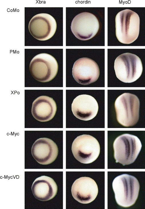 Fig. 4. Neither overexpression of Pontin or c-Myc nor morpholino injections alter the expression of marker genes. 1 ng of the indicated constructs and 4.3 ng PMo were injected into both blastomeres of two-cell stage embryos. None of the marker genes (stage 10 Xbra, stage 11.5 chordin and stage 16 MyoD) was changed. Note: from neurula stage onwards only the surviving PMo injected embryos could be taken for in situ hybridization.