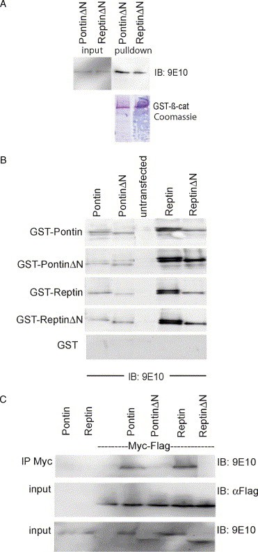 Fig. 5. Deletion of the N-terminus in xPontin and xReptin affects c-Myc binding but not homo- or heterodimerization. (A) GST pulldown assays reveal that N-terminal truncated Pontin and Reptin constructs bind to GST-β-catenin. NOP lysates of transfected HEK 293 cells were incubated with bacterially expressed immobilized GST-β-catenin. Bound proteins were eluted and stained in immunoblots with the 9E10 antibody for the presence of transfected xPontin and xReptin constructs. (B) GST pulldown assays documenting homo- and heterodimerization of full-length xPontin, xReptin and their N-terminally truncated mutants. NOP lysates corresponding to 5Ã106 HEK293 cells transfected with the indicated constructs were incubated with bacterially expressed immobilized GST-Pontin, GST-PontinδN, GST-Reptin, GST-ReptinδN or GST alone. Bound proteins were eluted and stained in immunoblots with the 9E10 antibody for the presence of exogenous xPontin and xReptin constructs. The transfected Reptin appears as double band. Most likely, the faster migrating band is due to protein degradation. (C) Binding of Pontin and Reptin to Myc requires the amino terminus. Shown are co-immunoprecipitation experiments from HEK293 cells transfected with flag-tagged murine Myc and 9E10 myc-tagged xPontin and xReptin constructs as indicated. Note: 9E10 specifically recognizes human (myc-tag) but not murine Myc protein. Lysates were precipitated with α-flag-antibody (âIP Mycâ); immunoblots were probed with the 9E10 antibody (IB 9E10) for the presence of exogenous xPontin and xReptin constructs or with α-flag-antibody (IB αflag) for exogenous c-Myc. Co-immunoprecipitations were done according to (Herold et al., 2002).