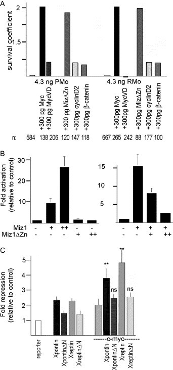 Fig. 7. Pontin and Reptin are co-repressors of c-Myc/Miz-1. c-Myc and dominant negative Miz-1 but not the c-MycV394D mutant, cyclin D2 or β-catenin rescue morpholino induced developmental arrest. Quantification of embryonic survival upon injection of the indicated constructs into both blastomeres of two-cell stage embryos. Phenotypes were analysed at early neurula stage. The survival coefficient is defined as the percentage of surviving embryos co-injected with the indicated constructs relative to morpholino-alone injected embryos of the same egg batch. Thus, the survival coefficient normalizes the different quality of egg batches so that a direct comparison of the injections is possible. Depending on the egg batch, PoMo led in 29â70% of the injected embryos to gastrula arrest, ReMo in 33â71%. The numbers of injected embryos are indicated at the bottom. (B) MizδZn is a dominant negative mutant of Miz-1. Shown are transient transfection assays in HeLa cells using the indicated CMV-based expression constructs. The p21 promoter was used as a reporter. The left panel documents the inability of MizδZn to activate the p21 reporter; the right panel documents the dominant negative activity towards wtMiz-1. (C) Xpontin and xReptin but not their N-terminal mutants enhance p21 repression in Hek293 cells in normal and co-transfected c-Myc background.