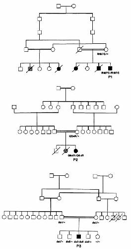 Pedigrees of the 3 NDI-families. Blackened symbols de
